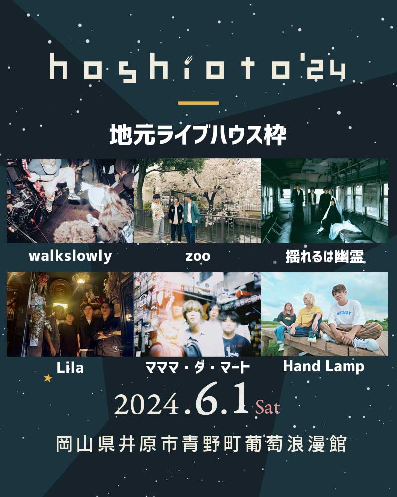 hoshioto’24では今年も「地元ライブハウス枠」として、岡山で活動するアーティストに数組出演していただく事になりました!